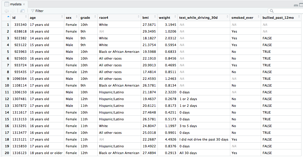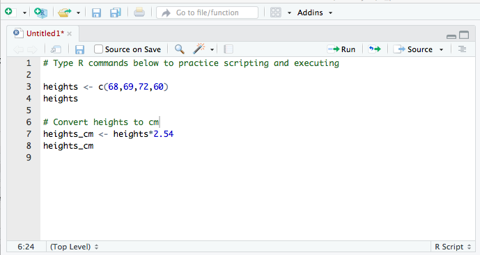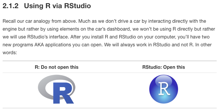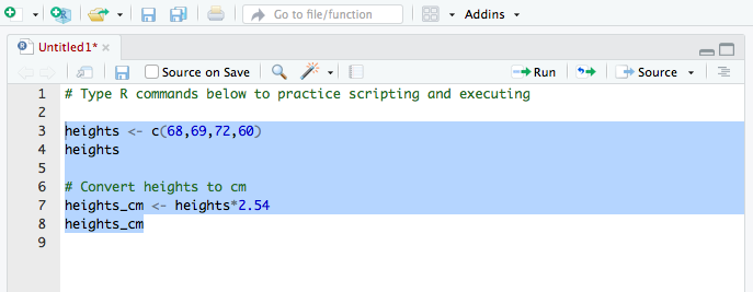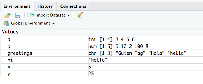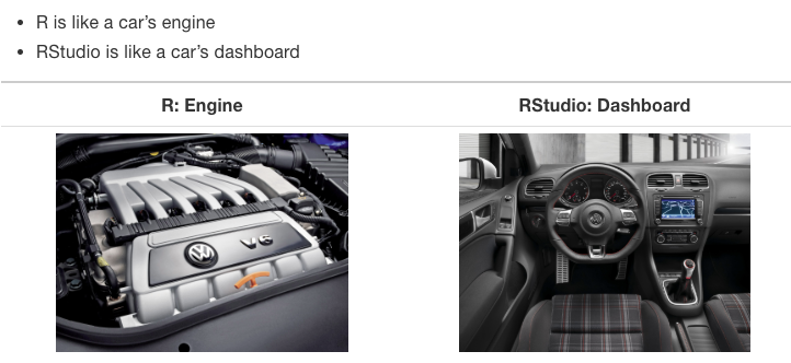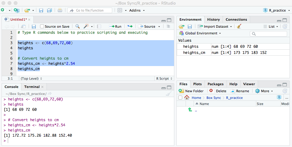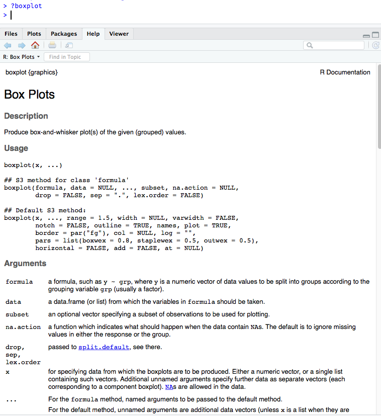 --- # Pre-course installation ## Install R - Windows : Download from https://cran.rstudio.com/bin/windows/base/ - Mac OS X: Download the latest .pkg file (currently R-3.5.2.pkg) from https://cran.rstudio.com/bin/macosx/ ## Install RStudio Desktop Open Source License - Select download file corresponding to your operating system from https://www.rstudio.com/products/rstudio/download/#download --- # Questions - Who has used R? - What other statistical software have you used? - Has anyone used other programming languages (C, java, python, etc)? - Why do you want to learn R? --- # Learning Objectives - Basic operations in R/RStudio - Understand data structures - Be able to load in data - Basic operations on data - Be able to make a plot - Know how to get help --- class: center, inverse, middle # Introduction Rrrrrr? --- # What is R? .pull-left[ - A programming language - Focus on statistical modeling and data analysis + import data, manipulate data, run statistics, make plots - Useful for "Data Science" - Great visualizations - Also useful for most anything else you'd want to tell a computer to do - Interfaces with other languages i.e. python, C++, bash ] .pull-right[  ] For the history and details: [Wikipedia](https://bit.ly/1efFmaY) - an interpreted language (run it through a command line) - procedural programming with functions - Why "R"?? Scheme (?) inspired S (invented at Bell Labs in 1976) which inspired R (**free and open source!** in 1993) --- # What is RStudio?  - R is a programming language - RStudio is an integrated development environment (IDE) = an interface to use R (with perks!) from [Modern Dive](https://moderndive.com/2-getting-started.html); see also [DataCamp's video discussion on the difference](https://campus.datacamp.com/courses/working-with-the-rstudio-ide-part-1/orientation?ex=1) --- # Start RStudio  from [Modern Dive](https://moderndive.com/2-getting-started.html) --- # RStudio anatomy  from [Emma Rand](http://www-users.york.ac.uk/~er13/17C%20-%202018/pracs/01IntroductionToModuleAndRStudio.html#what_are_r_and_rstudio) --- # Rstudio demo --- class: inverse, middle, center # Let's code! --- # Coding in the console .pull-left[ __Typing and execting code in the console __ * Type code in the console * Press __return__ to execute the code <br> _Coding in the console is not advisable for most situations!_ * We only recommend this for short pieces of code that you don't need to save ] .pull-right[ ```r > 7 ``` ``` [1] 7 ``` ```r > 3 + 5 ``` ``` [1] 8 ``` ```r > "hello" ``` ``` [1] "hello" ``` ```r > # this is a comment, nothing happens > # 5 - 8 ``` ] --- # We can do math .pull-left[ ```r > 10^2 ``` ``` [1] 100 ``` ```r > 3 ^ 7 ``` ``` [1] 2187 ``` ```r > 6/9 ``` ``` [1] 0.6666667 ``` ```r > 9-43 ``` ``` [1] -34 ``` ] -- .pull-right[ R follows the rules for order of operations and ignores spaces between numbers (or objects) ```r > 4^3-2* 7+9 /2 ``` ``` [1] 54.5 ``` The equation above is computed as `$$4^3 − (2 \cdot 7) + \frac{9}{2}$$` ] --- # Logarithms and exponentials .pull-left[ Logarithms: `log()` is base `\(e\)` ```r > log(10) ``` ``` [1] 2.302585 ``` ```r > log10(10) ``` ``` [1] 1 ``` ] -- .pull-right[ Exponentials ```r > exp(1) ``` ``` [1] 2.718282 ``` ```r > exp(0) ``` ``` [1] 1 ``` ] <br> -- Check that `log()` is base `\(e\)` ```r > log(exp(1)) ``` ``` [1] 1 ``` --- # Variables Data, information, everything is stored as a variable * Can assign a variable using either `=` or `<-` - Using `<-` is preferable .pull-left[ Assigning just one value: ```r > x = 5 > x ``` ``` [1] 5 ``` ```r > x <- 5 > x ``` ``` [1] 5 ``` ] -- .pull-right[ Assigning a __vector__ of values * Consecutive integers ```r > a <- 3:10 > a ``` ``` [1] 3 4 5 6 7 8 9 10 ``` * __Concatenate__ a string of numbers ```r > b <- c(5, 12, 2, 100, 8) > b ``` ``` [1] 5 12 2 100 8 ``` ] --- # We can do math with variables .pull-left[ Math using variables with just one value ```r > x <- 5 > x ``` ``` [1] 5 ``` ```r > x + 3 ``` ``` [1] 8 ``` ```r > y <- x^2 > y ``` ``` [1] 25 ``` ] -- .pull-right[ Math on vectors of values: element-wise computation ```r > a <- 3:6 > a ``` ``` [1] 3 4 5 6 ``` ```r > a+2 ``` ``` [1] 5 6 7 8 ``` ```r > a*3 ``` ``` [1] 9 12 15 18 ``` ```r > a*a ``` ``` [1] 9 16 25 36 ``` ] --- # Variable can include text (characters) ```r > hi <- "hello" > hi ``` ``` [1] "hello" ``` ```r > greetings <- c("Guten Tag", "Hola", hi) > greetings ``` ``` [1] "Guten Tag" "Hola" "hello" ``` --- # Viewing list of defined variables <!-- __List of defined variables (and other objects)__ --> * The R command to see what objects have been defined is `ls()`. * This list includes all defined objects (including dataframes, functions, etc.) ```r > ls() ``` ``` [1] "a" "b" "greetings" "hi" "x" "y" ``` * You can also look at the list in the Environment window:  --- # Removing defined variables * The R command to delete an object is `rm()`. ```r > ls() ``` ``` [1] "a" "b" "greetings" "hi" "x" "y" ``` ```r > rm("greetings", hi) # Can run with or without quotes > ls() ``` ``` [1] "a" "b" "x" "y" ``` * Remove EVERYTHING - _Be careful!!_ ```r > rm(list=ls()) > ls() ``` ``` character(0) ``` * Can also remove everything using the _Clear Workspace_ option in the _Session_ menu. --- # Common console errors __Incomplete commands__ .pull-left[ * When the console is waiting for a new command, the prompt line begins with `>` + If the console prompt is `+`, then a previous command is incomplete + You can finish typing the command in the console window ] .pull-right[ Example: ```r > 3 + (2*6 + ) ``` ``` [1] 15 ``` ] -- __Object is not found__ * This happens when text is entered for a non-existent variable (object) Example: ```r > hello ``` ``` Error in eval(expr, envir, enclos): object 'hello' not found ``` --- class: inverse, center, middle # R scripts (save your work!) --- # Coding in a script (1/3) <!-- * Note that both of these options show the keyboard shortcut for your operating system --> * __Create a new script__ by + selecti